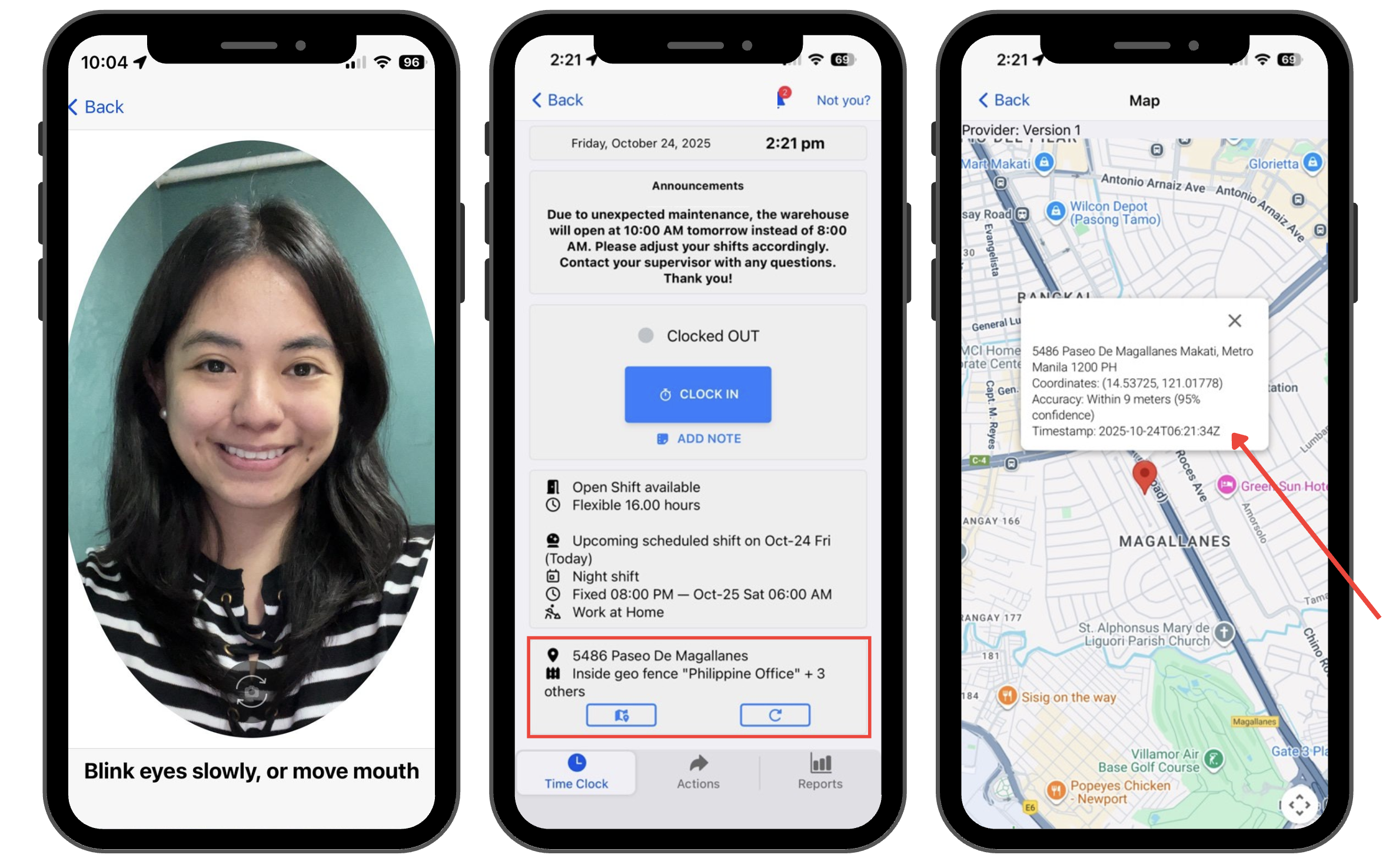 Preview Feature: Facial Recognition (Left), Worker Screen (Center), and Map View (Right)